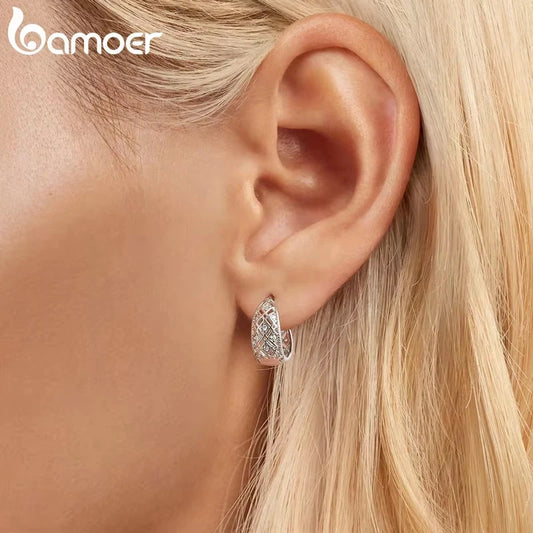 BAMOER Hollow Lace Huggie Hoop Earrings 925 Sterling Silver CZ Hypoallergenic Ear Buckles for Women Jewelry Gift BSE1035
