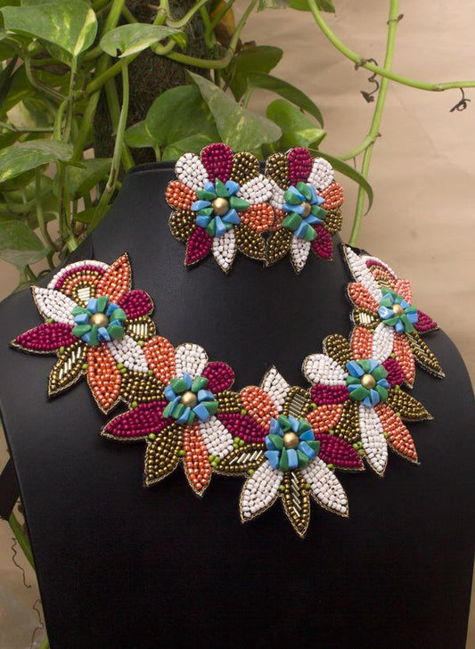 This beautifully handmade necklace set in mixed materials like beads , resham thread and mirrors...