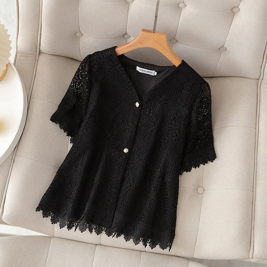 Hollow Lace Shirt Women's Summer New Plus Size Thin Temperament Beautiful Chic V-Neck Puff Sleeve Blouse