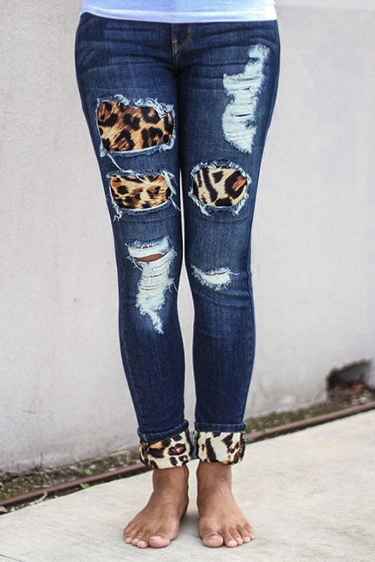 Fashion Women's Blue Hollow Out Leopard Splice Ripped Jeans