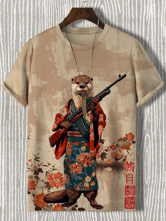 Men's T-Shirt Japanese Style Samurai Cat Graphic 3D Printed T-Shirt Casual Short Sleeved Tee Outdoor Oversized Men Clothing Tops