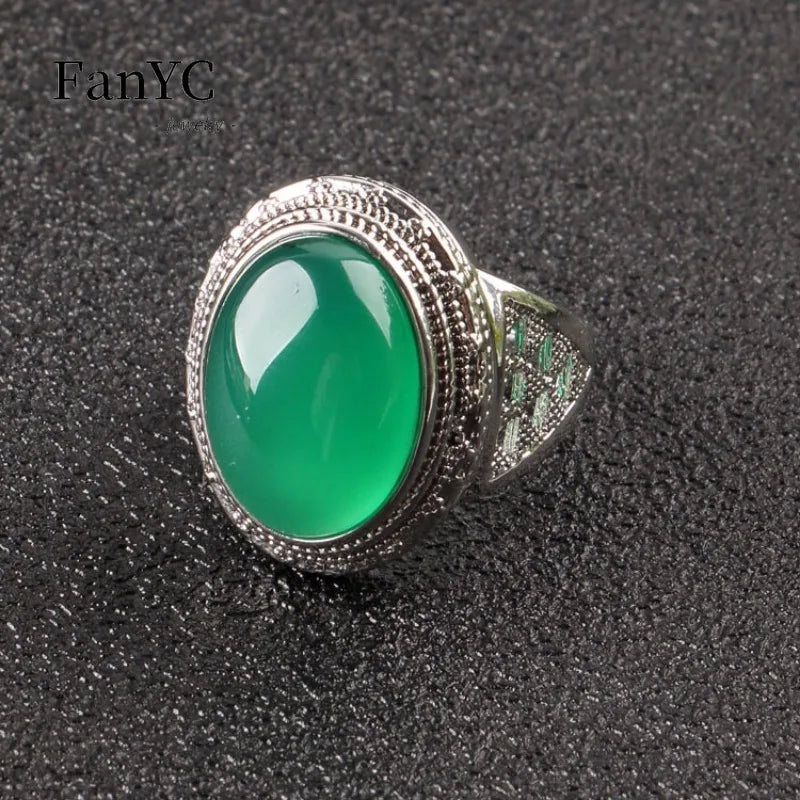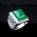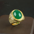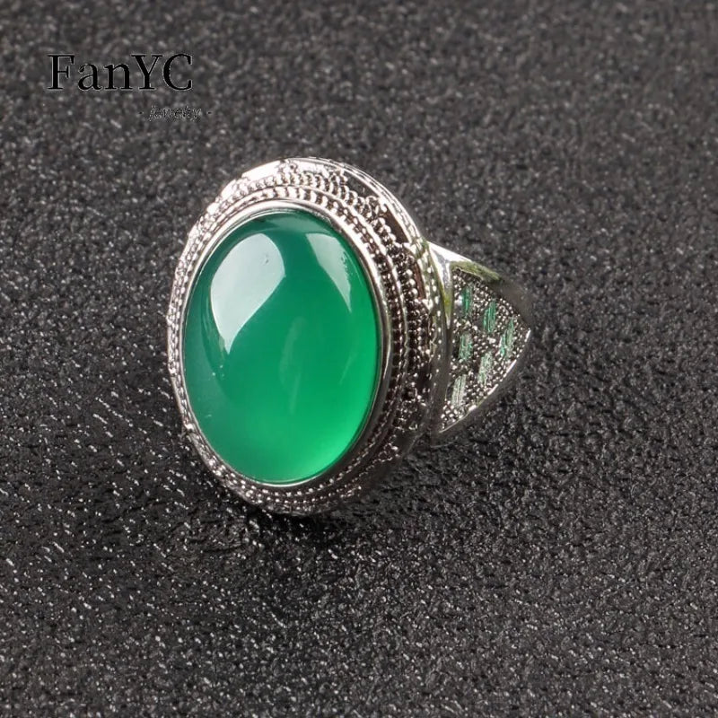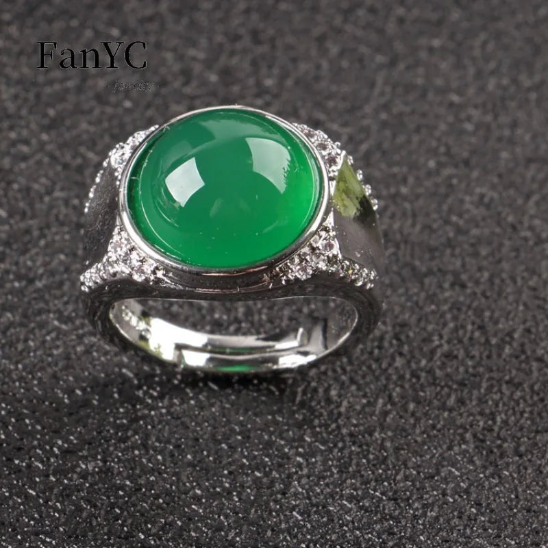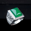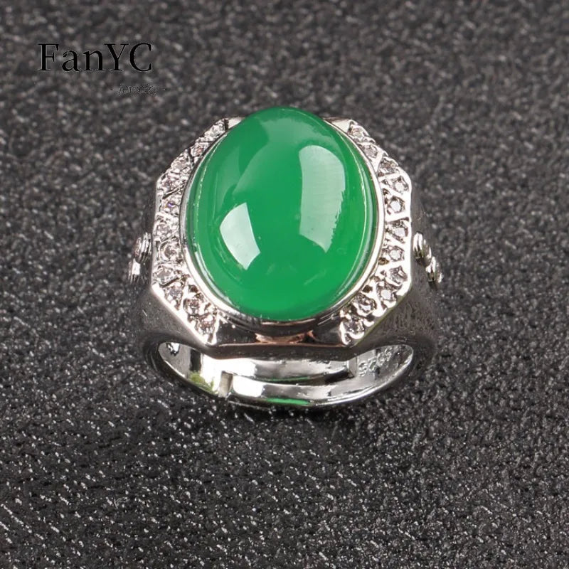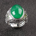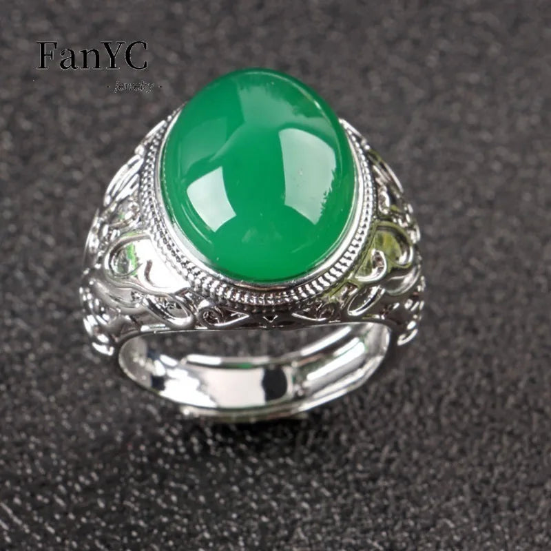 Natural 925 Silver Inlaid Green Agate Jade Ring Vintage Exquisite Men's Jewelry Adjustable Finger Ring Holiday Gift