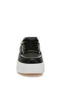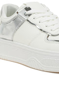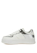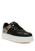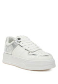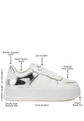 A unique combination of comfort and edgy can be found in these faux leather sneakers with flatform heels and metallic paneling. A fresh and trendy look is created by the eye-catching metallic detail combined with the classic lace up design. The sneakers are perfect to amp up any basic ensembles!