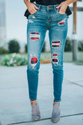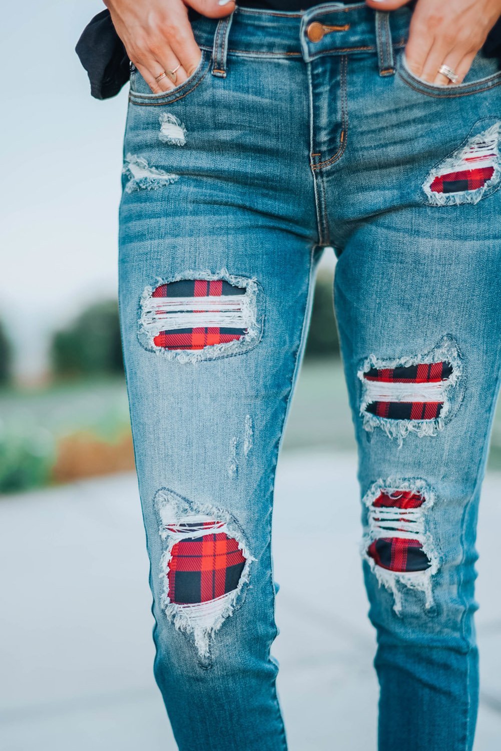Women's Fashion Red Plaid Patch Destroyed Skinny Jeans
